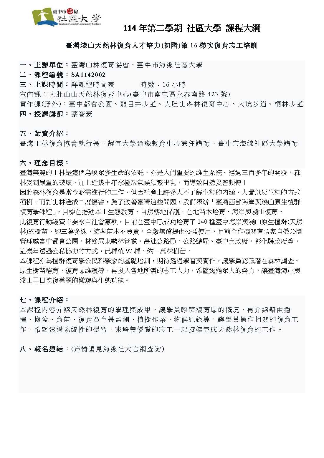 SA1142002台灣淺山天然林復育人才培力(初階)