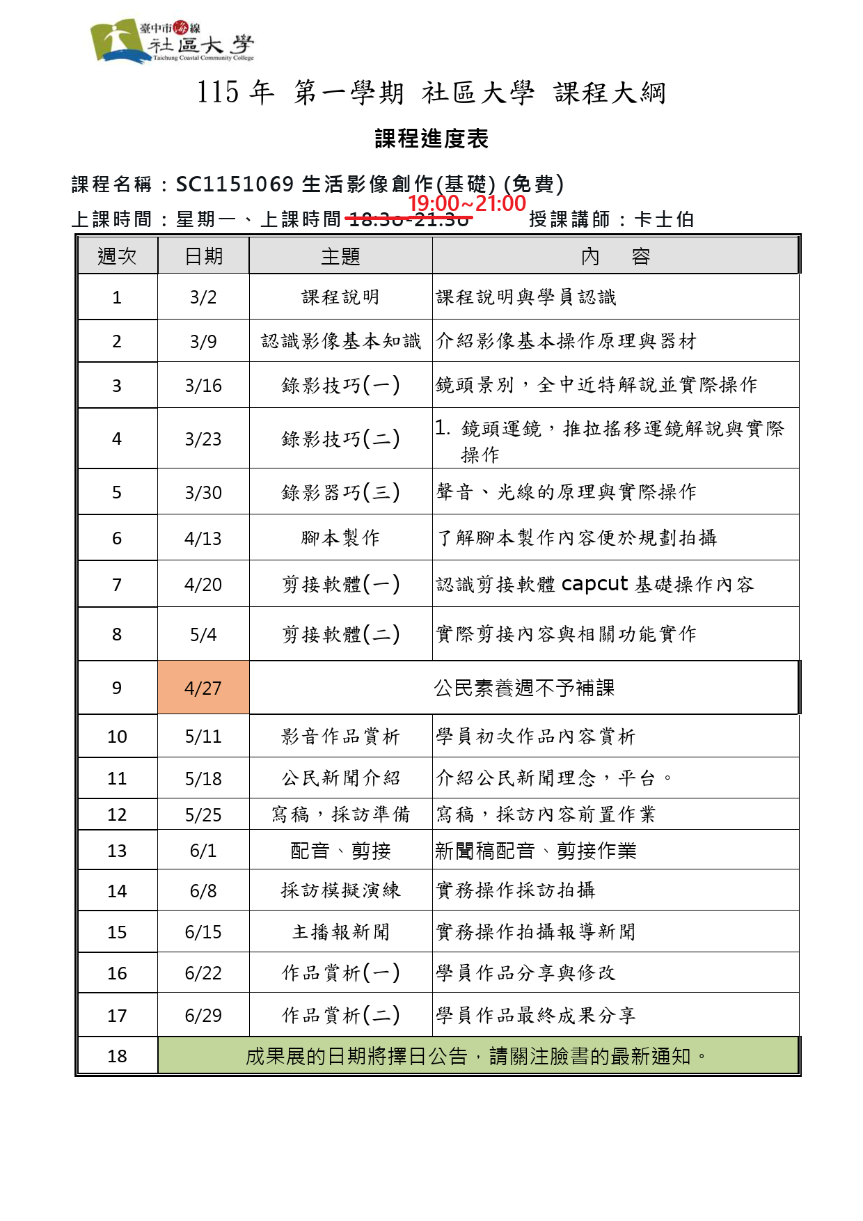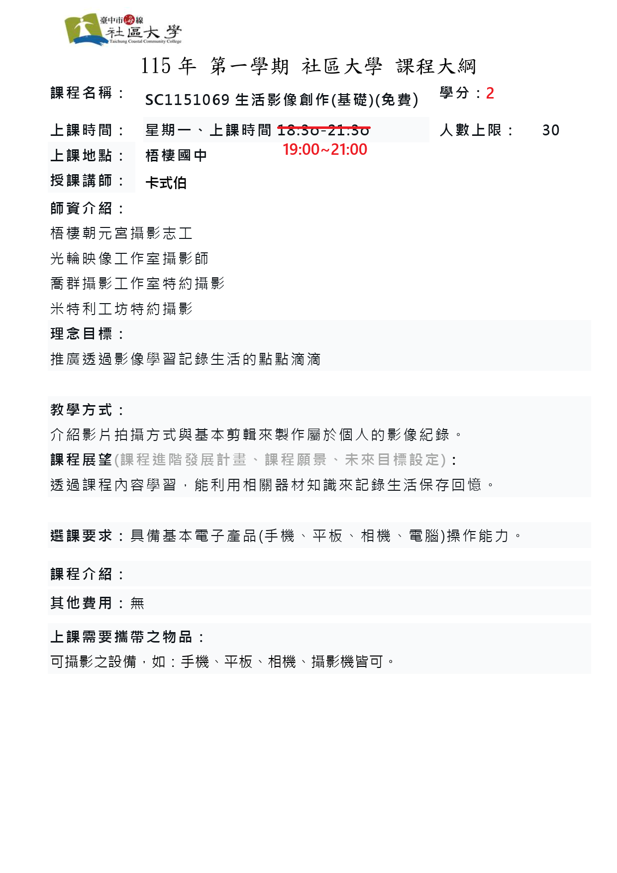 免費課程會收取保證金1000元 於期末完成以下要求後退還: 1. 出缺席不得超過 6 堂。 2. 參與至少 1 次公民素養週活動。 3. 若有文史聯盟講座,亦需參與一次;若社大另有活動,也需配合參與。 4. 完成學期內指定作業。